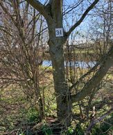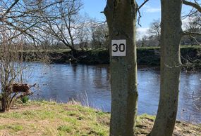Peg numbers on the South Bank are marked with orange paint on rocks as there are no convenient trees. To avoid double-bank pegging, the first peg on the south side is 33, which is just downstream of where Skeeby Beck enters the Swale on the Northside.