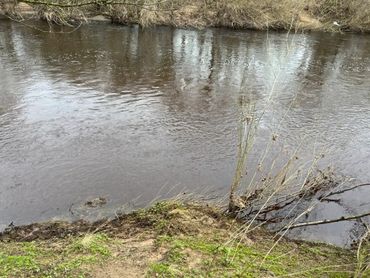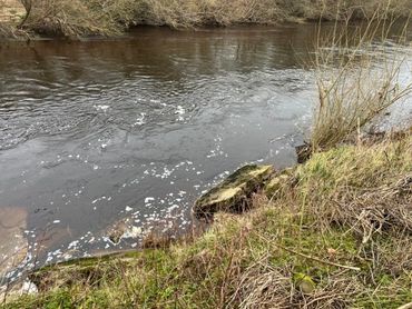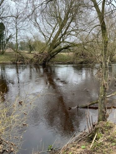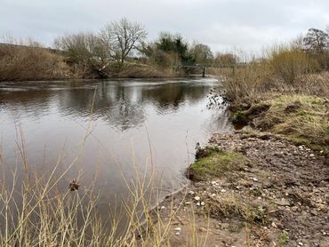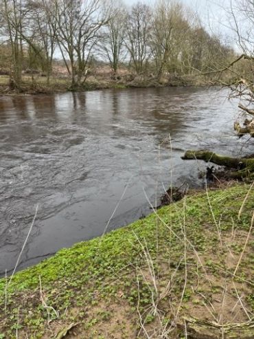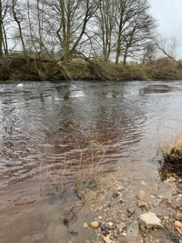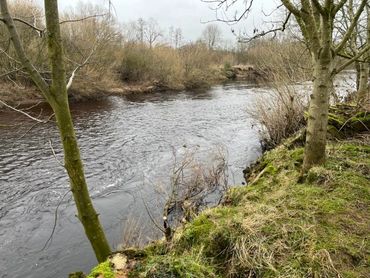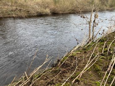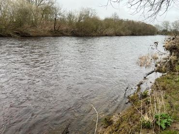 Access to peg 1 is through a gap in the barbed wire fence, a few yards below the peg itself. The banks are high and steep here and great care should be taken especially in wet conditions - there are many concrete/stone slabs on the bank covered in moss which are very slippery in wet conditions. There is a fast riffle at the top of the peg and deep water close to the near bank. Peg 1 is about 300 mtrs long.